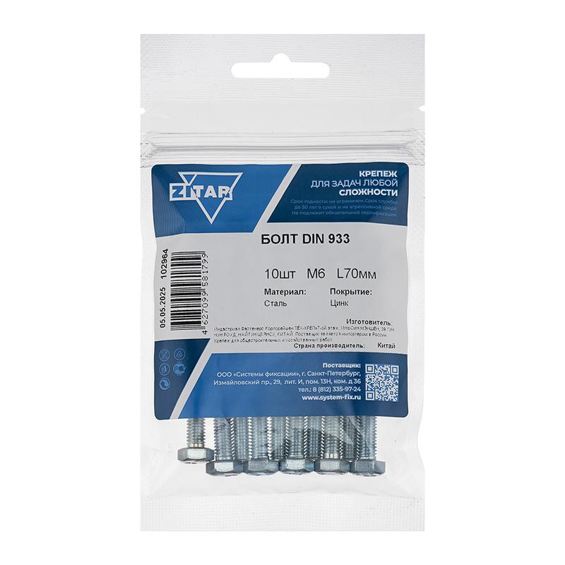Болт с шестигранной головкой М6х70 DIN 933 оцинк. (уп.10шт) Tech-Krep/Zitar 102964 Доставка по России : цена — купить в интернет-магазине | Характеристики, фото
