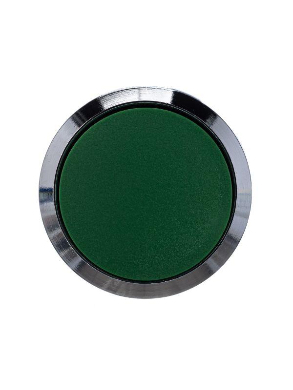 Представляет собой нажимную кнопку управления диаметром отверстия 22 мм, высотой 32 мм, без подсветки, зеленого цвета, с хромированным ободом по диаметру.