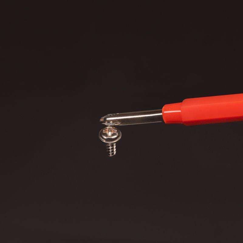 Тестер оснащен переставным жалом, которое может быть использовано в двух вариантах: крестообразное или шлицевое. Это позволяет оператору выбрать подходящий тип жала в зависимости от требований конкретной ситуации. Сталь высокой закалки (50HRC) позволяет использовать тестер как отвертку. Наличие намагниченных наконечников обеспечивает удобство при удержании винтов, что особенно полезно при работе с клеммными колодками и светильниками.