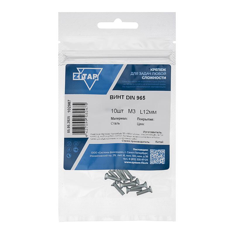 Винт с потайной головкой М3х12 DIN 965 оцинк. (уп.10шт) Tech-Krep/Zitar 102987 Доставка по России : цена 15,98 руб. — купить в интернет-магазине | Характеристики, фото