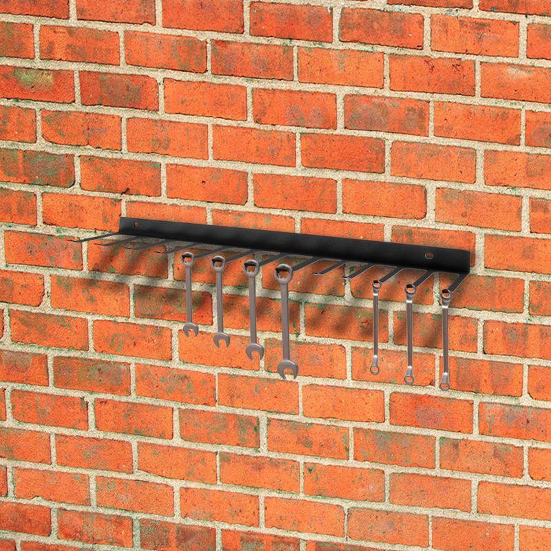 Кронштейн имеет продуманную конструкцию, предусматривающую место для хранения 13 ключей. Позволяет легко и удобно расположить гаечные или накидные ключи от 5 до 40 мм в гараже, кладовке, мастерской, а также на балконе, складе и в других местах.