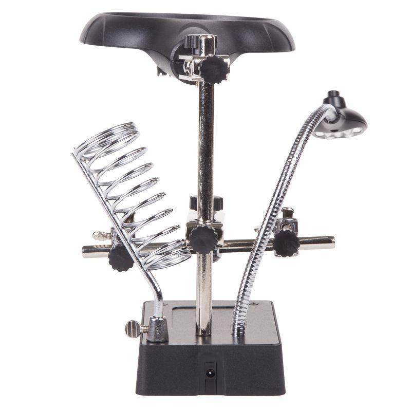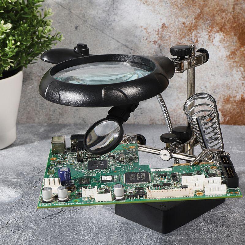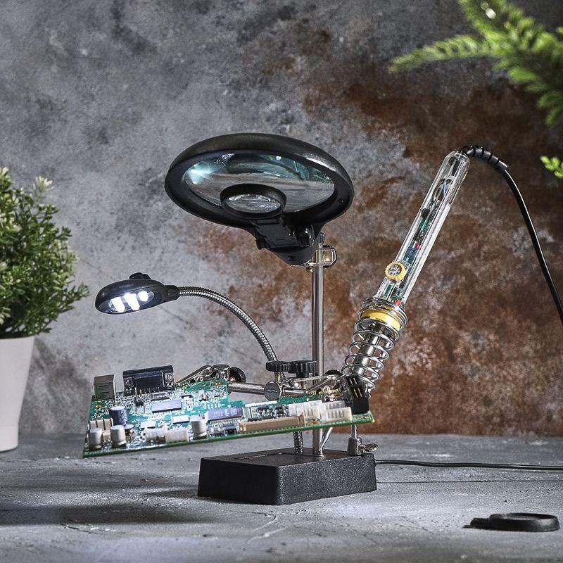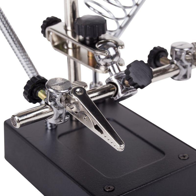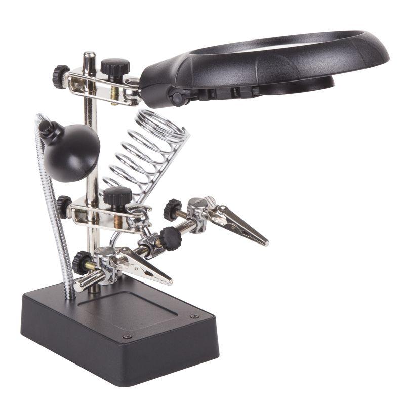 Инструмент состоит из основания (подставка), шарнирного соединения с зажимами типа «крокодил» (подвижных во всех плоскостях, с никелевым покрытием), трёх луп с кратностью увеличения 2.5x (диаметр 90 мм), 7.5x (диаметр 34 мм) и 10x (диаметр 34мм), а также модуля подсветки.