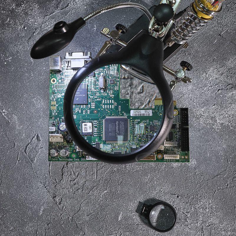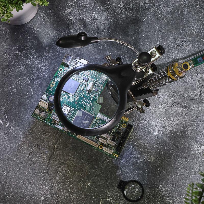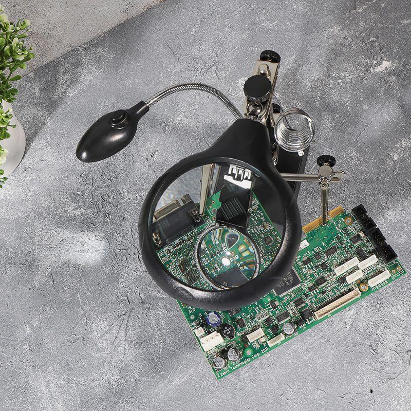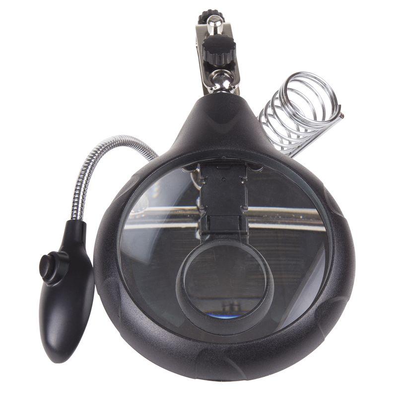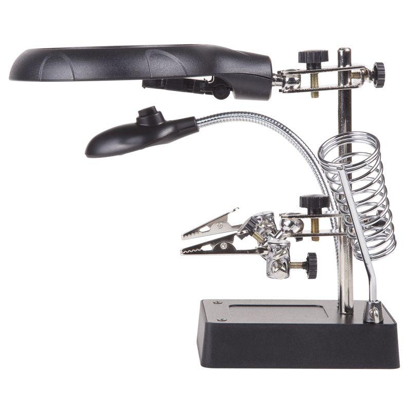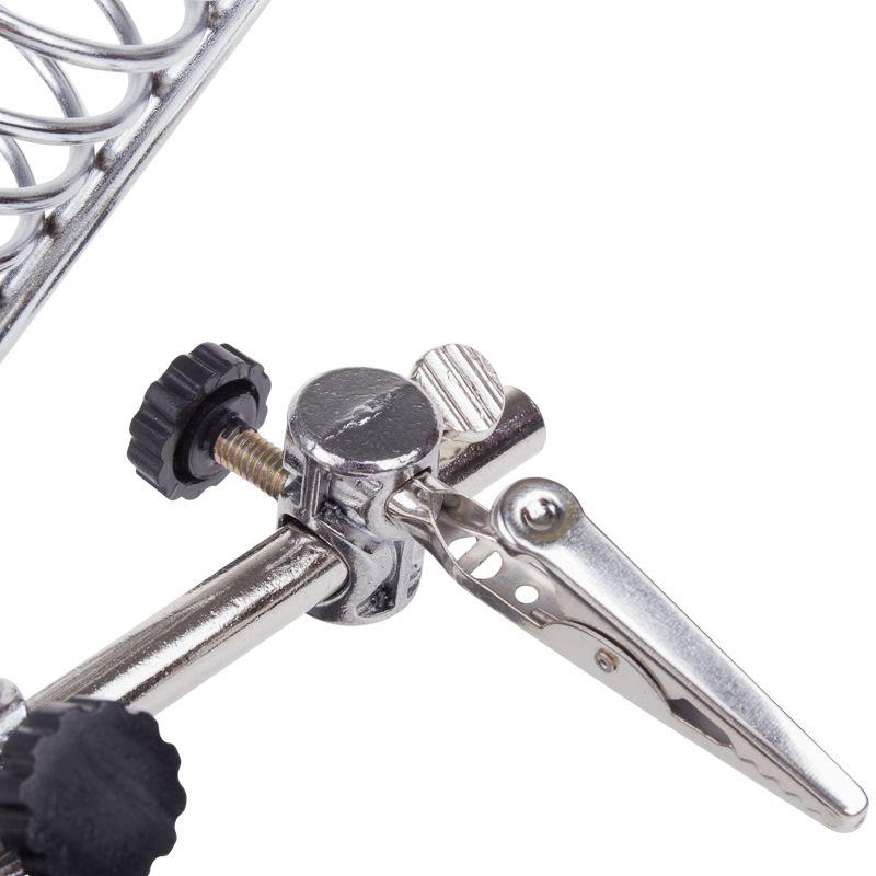 Инструмент состоит из основания (подставка), шарнирного соединения с зажимами типа «крокодил» (подвижных во всех плоскостях, с никелевым покрытием), трёх луп с кратностью увеличения 2.5x (диаметр 90 мм), 7.5x (диаметр 34 мм) и 10x (диаметр 34мм), а также модуля подсветки.