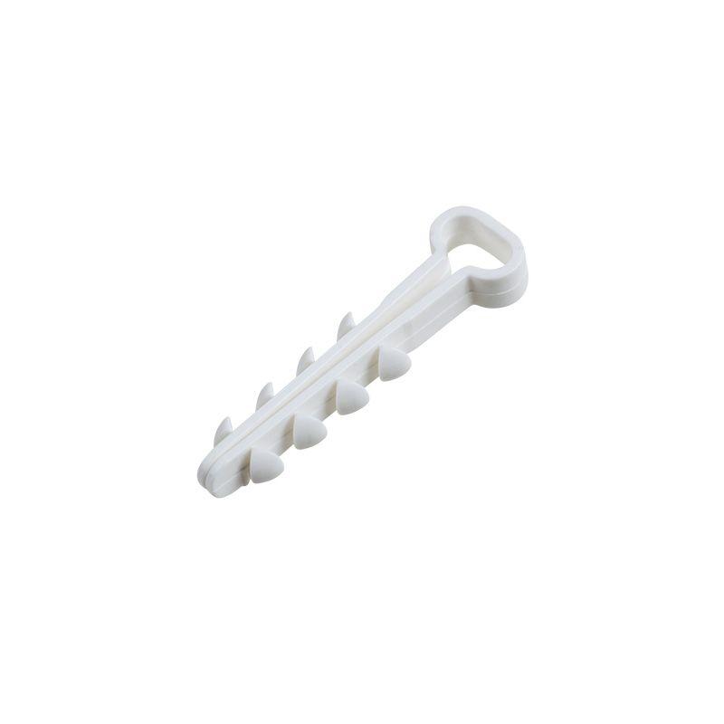 Дюбель-хомут представляет собой крепежное изделие с петлей для удержания кабеля и уникальной системой боковых шипов типа «елочка». Благодаря шипам крепеж легко вставляется в отверстие и не выпадает, а для извлечения такого дюбеля понадобятся плоскогубцы. Важно: для надежной фиксации дюбеля необходимо соблюдать точные параметры при сверлении отверстия, а для этого желательно использовать новую оснастку, которая не успела износиться. Дюбель может быть установлен в бетон, кирпич, газобетон и природный камень. Морозостойкие добавки добавляют крепежу устойчивость к низким температурам и позволяют использовать его на улице или в неотапливаемых помещениях.
