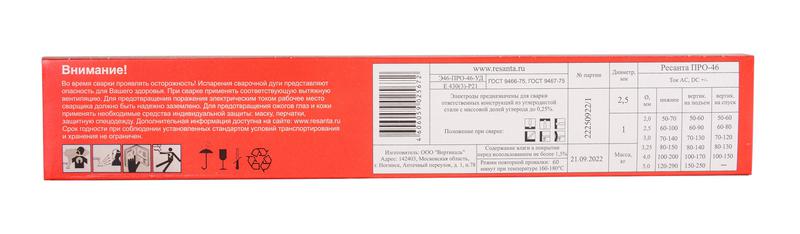 Сварочные электроды РЕСАНТА ПРО-46:• Малочувствительны к качеству подготовки кромок свариваемых деталей.• Позволяют проводить сварку оцинкованной, окрашенной, загрязненной и слегка ржавой стали, а также на обильно увлажненной поверхности.• Обладают повышенной, на 20% большей, прочностью сварного шва по сравнению с электродами марки МР-3• Позволяют выполнять сварку на предельно низких токах во всех пространственных положениях, в том числе «сверху вниз».• ПРО-46 просты в применении даже для начинающих сварщиков, в сравнении с моделями основных конкурентов, т.к. отличаются более легким начальным и повторным поджигом, мягким и стабильным горением дуги.• Малые потери металла от разбрызгивания• Отличное формирование металла шва• Легкая отделимость шлаковой корки• Возможность проводить сварку на переменном и постоянном токах, Тип товаров: Электроды РЕСАНТА, Вес в упаковке: 1 кг, Гарантия, мес.: 12, Свариваемый материал: Сталь, Покрытие: Рутиловое, Длина, мм: 350, Диаметр, мм: 2, Назначение: Универсальные, Страна бренда: Латвия, Страна производства: Россия, Модель: ПРО-46 Ф2,5 Пачка 1 кг, Штрихкод EAN-13: 4606060000000"