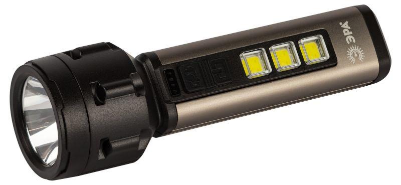 Ручка фонаря изготовлена из алюминия. Новый LED-фонарь имеет эргономичную конструкцию и комфортно лежит в руке. Кнопки включения прорезинены и приятны на ощупь. Ёмкий литиевый аккумулятор 800 мАч отлично держит заряд. После полной подзарядки фонарь светодиодный ЭРА «Прометей» непрерывно светит 2 часа. Есть индикатор заряда. Ручной фонарь отличается повышенным световым потоком – 420 Лм. Выпускается в презентабельной блистерной упаковке.