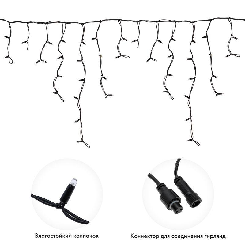 Гирлянда имитирует сосульки и может послужить оригинальным решением при украшении карнизов, арок, фасадов зданий, витрин магазинов, а также стать эффектным элементом декора внутри помещений.