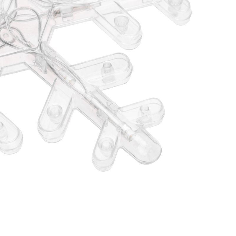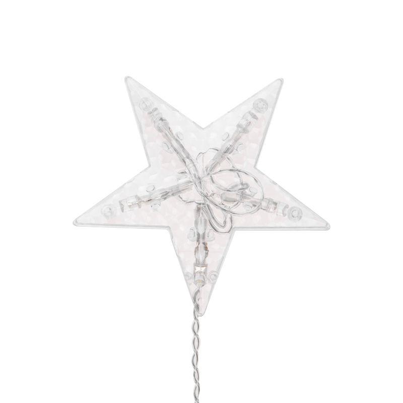 Гирлянда представляет собой горизонтальный шнур-шину, к которому крепятся вертикальные длинные нити, украшенные снежинками и звездами.