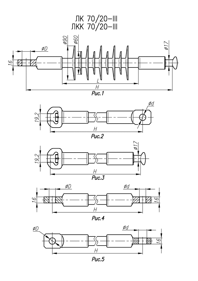 | Обозначение изолятора | № рис. | L, мм | H, мм | D, мм | d, мм |