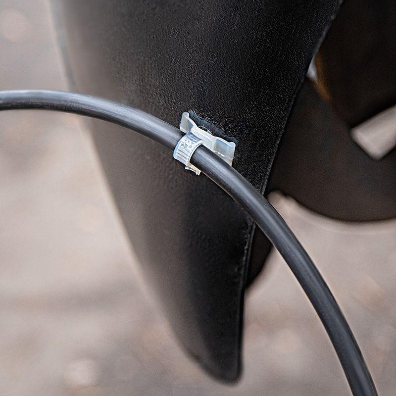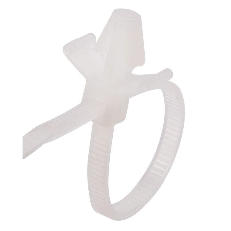 Главным достоинством хомута является имеющийся у него крепёжный пистон. Благодаря ему пучок проводов, собранный хомутом, можно прикрепить практически к любой поверхности, толщиной не более 2,4 мм, в которой подготовлено отверстие для пистона.