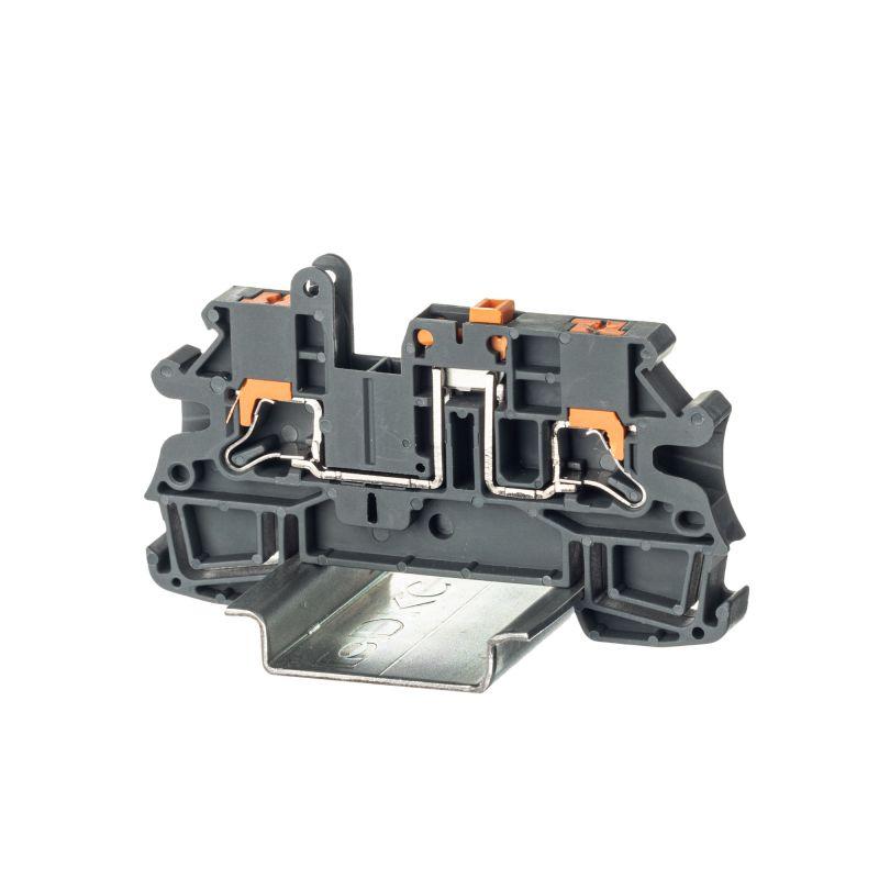 Серый цвет, 2 точки подключения, 4 мм2. 2 канала для вставных перемычек. Винты с гнездами для щупа (P-P). Габариты (В?Ш?Г) 42?69?6,2 мм.