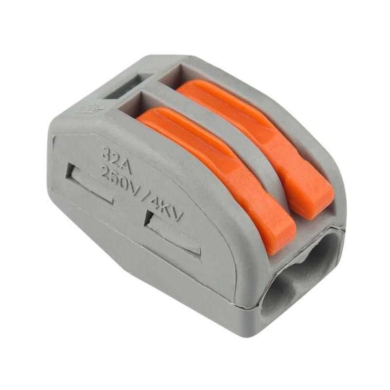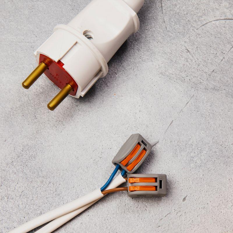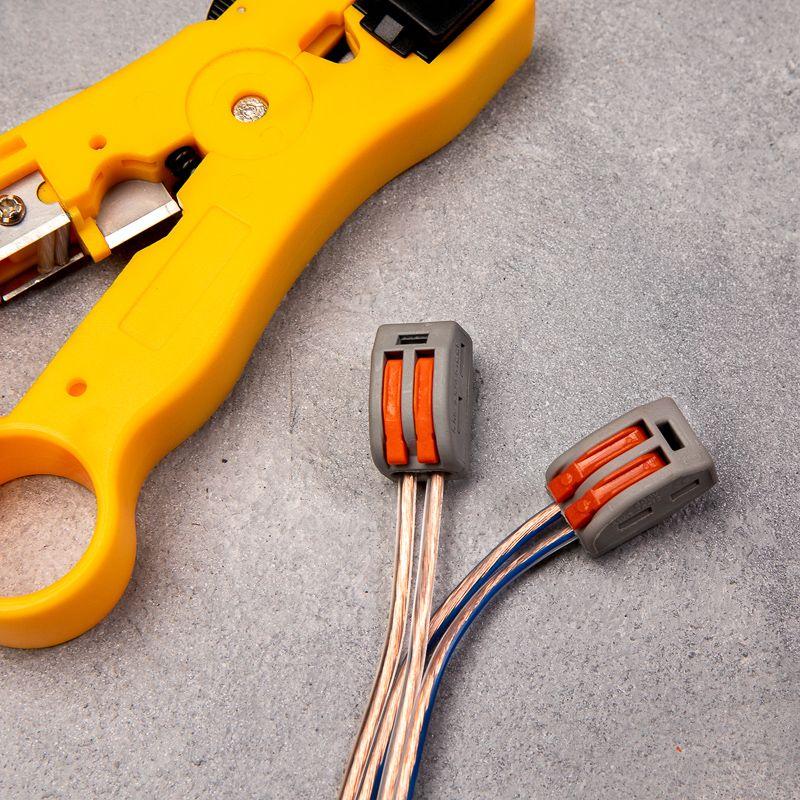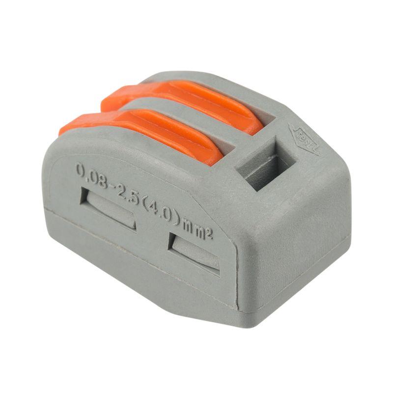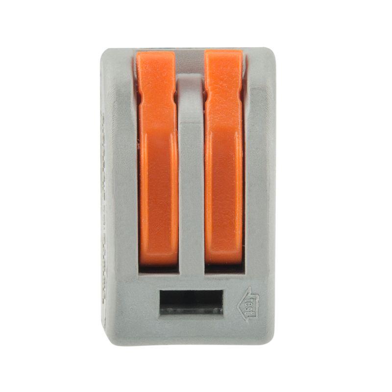 Перед монтажом с соединяемых проводников необходимо снять изоляцию в соответствии с обозначениями на корпусе клеммы (9-12 мм). Зачищенный участок с монтажной стороны не должен иметь сильных изгибов. Вставьте его в свободное гнездо клеммы, предварительно подняв оранжевый рычажок, после этого опустите рычажок в исходное положение. Контакт осуществляется путем зажима проводника пластиной. Конструкция предотвращает случайное размыкание контакта. Специальное технологическое отверстие на корпусе клеммы предназначено для проверки соединения тестером-пробником или щупом мультиметра. Корпус из пластика делает контакт изолированным.