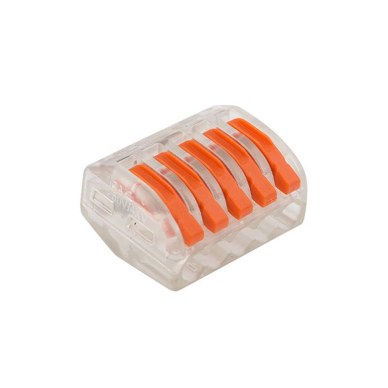 Перед монтажом с соединяемых проводников необходимо снять изоляцию в соответствии с обозначениями на корпусе клеммы (9-12 мм). Зачищенный участок с монтажной стороны не должен иметь сильных изгибов. Вставьте его в свободное гнездо клеммы, предварительно подняв оранжевый рычажок, после этого опустите рычажок в исходное положение. Контакт осуществляется путем зажима проводника пластиной. Конструкция предотвращает случайное размыкание контакта. Специальное технологическое отверстие на корпусе клеммы предназначено для проверки соединения тестером-пробником или щупом мультиметра. Оболочка из прозрачного пластика делает контакт изолированным, а также позволяет визуально оценить положение проводника.