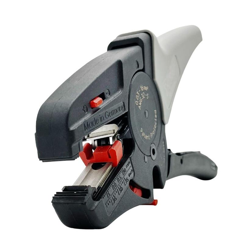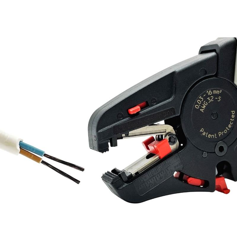Инструмент имеет регулировку по длине зачистки кабеля до 20 мм. Так же дополнительный механизм позволяет отрегулировать силу примыкания ножей инструмента при работе с кабелями с мягкой изоляцией. Отрезной нож находится снизу и закрывается предохранительной планкой, что исключает незапланированный контакт с кабелями при работе.