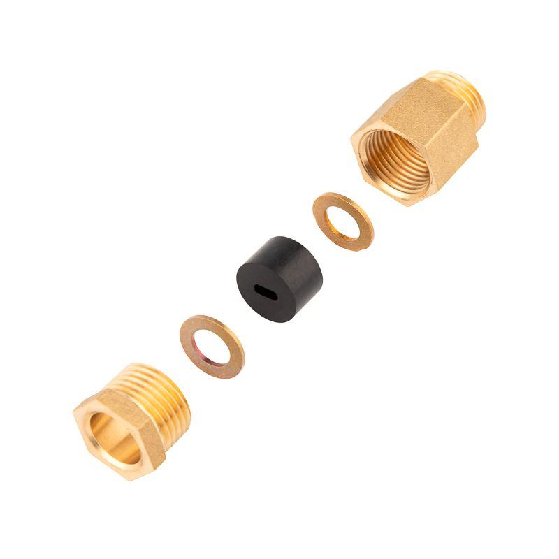 В составе комплекта поставляют: втулку с внешней резьбой ? (23 мм гаечный ключ); латунные шайбы; уплотнение из силикона; вставка к трубе с внутренней и внешней резьбой ? (23 мм гаечный ключ).