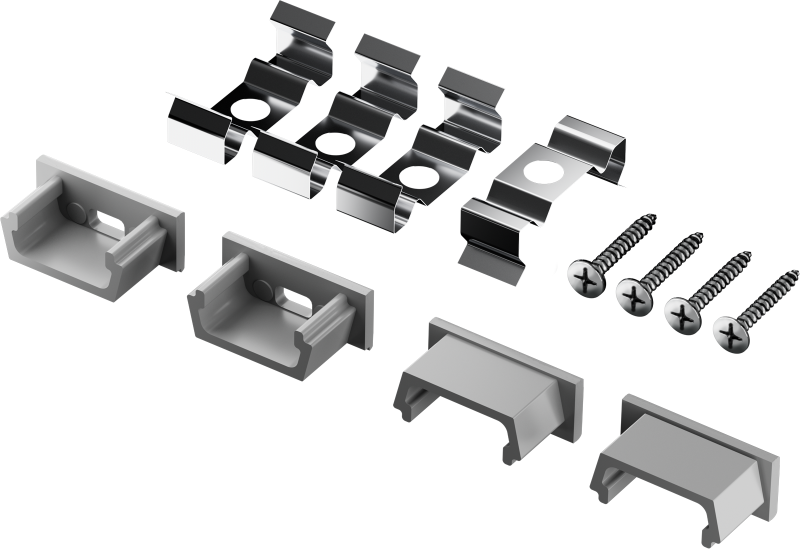 Монтажный комплект содержит все необходимое для установки светодиодной ленты на поверхность: стальные клипсы для крепления профиля, пластиковые_x000D_