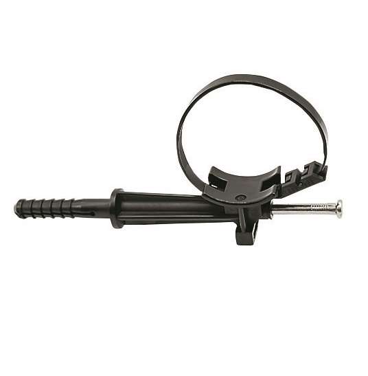 Представляет собой средство крепления к фасаду и стенам самонесущих изолированных проводов диаметром 16-150 мм. Изготовлено из металла, устойчивого к механическим повреждениям и коррозии. В комплекте колпачок для дополнительной защиты гвоздя от коррозии. Конструкцией крепления предусмотрен ремень из пластика для крепления дополнительного СИП.