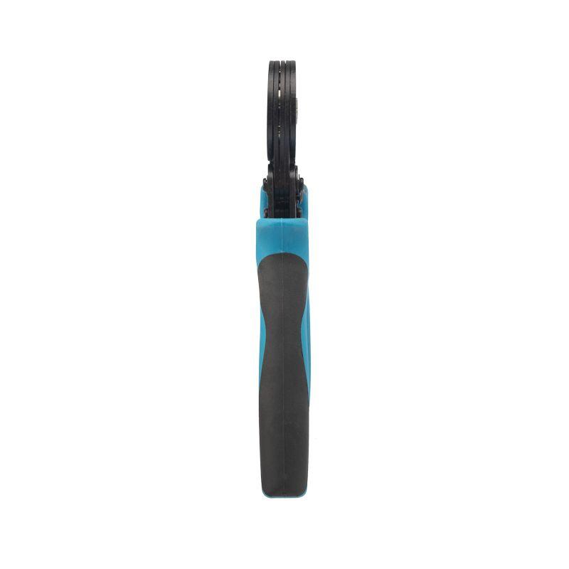 Корпус кримпера изготовлен из высокопрочной закаленной инструментальной стали с воронением, благодаря чему устойчив к механическим воздействиям и имеет продолжительный срок службы. Шестисегментная саморегулирующаяся матрица с системой поворотных кулачков диафрагменного типа выполняет гексагональный профиль обжима, обеспечивая равномерное распределение силы обжима. Есть возможность регулировать давление опрессовки. Возвратный механизм обеспечивает обратный ход рукояток и упрощает процесс работы с инструментом. Храповой механизм производит полный цикл качественной опрессовки. Двухкомпонентные защитные рукоятки выполнены из плотного нескользящего синтетического материала, который делает работу с инструментом легкой и приятной.