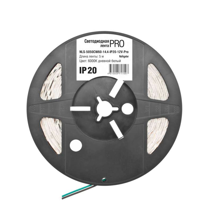 Представляет собой полосу длиной 5 м, со светодиодами в количестве 60 шт./1 м, с длиной секции 50 мм. Самоклеющаяся, без адаптера подключения. Дает белый свет. Цветовая температура 6000 К.