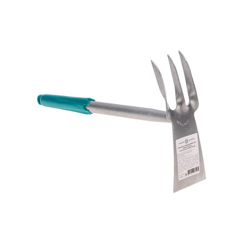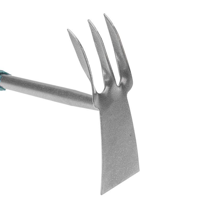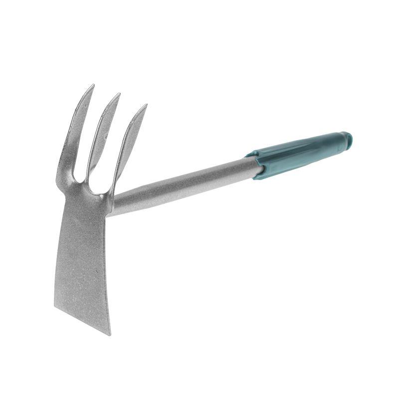 Рабочая часть и рукоятка выполнены из метала с порошковым покрытием, благодаря чему грабли обладают долговечностью, прочностью и надежностью. Конструктивно рабочая часть состоит из лопатки и 3 витых зубцов.