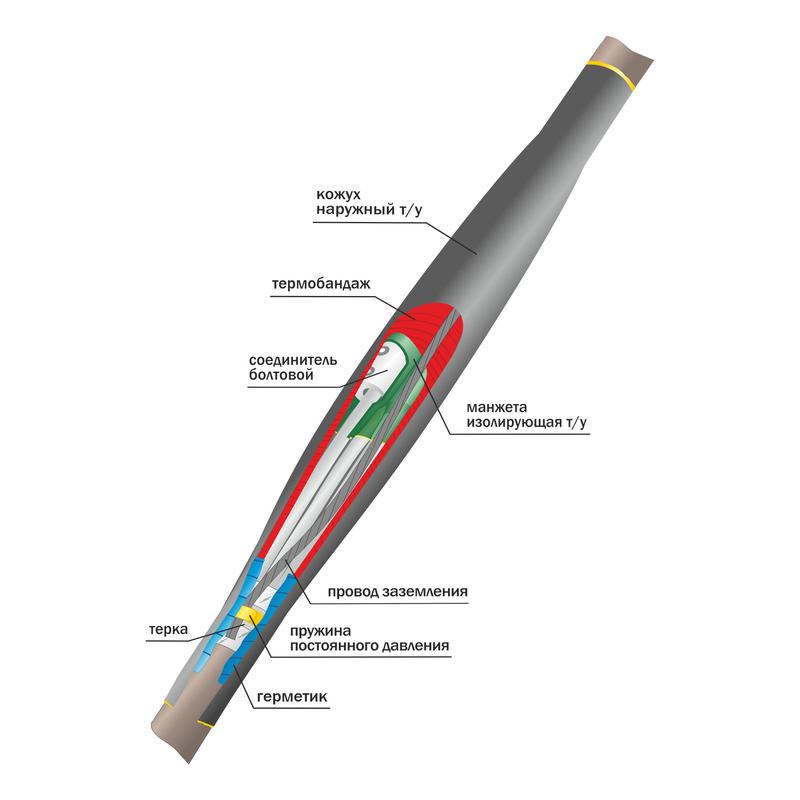 Универсальные болтовые соединители со срывными головками, входящие в комплект кабельной муфты, подходят для кабелей как с алюминиевыми, так и с медными жилами. Комплект заземления предусматривает крепление провода заземления к бронелентам соединяемых кабелей с применением роликовых пружин постоянного давления и контактных терок. Обладает необходимым уровнем устойчивости к воздействию агрессивных внешних факторов.