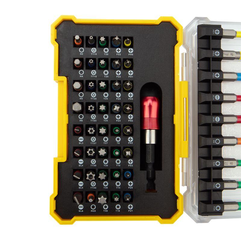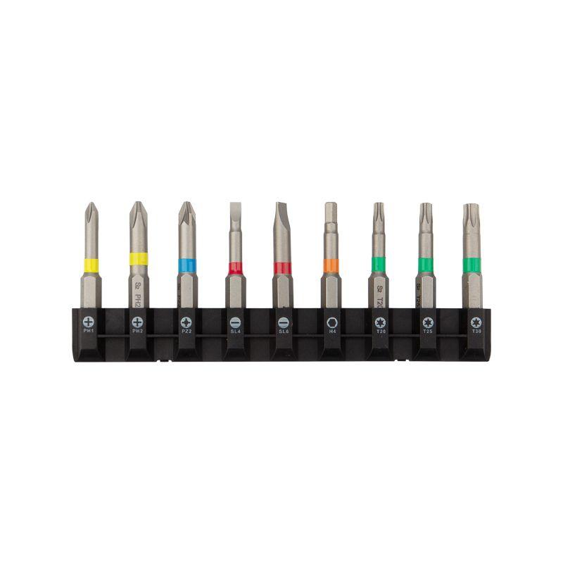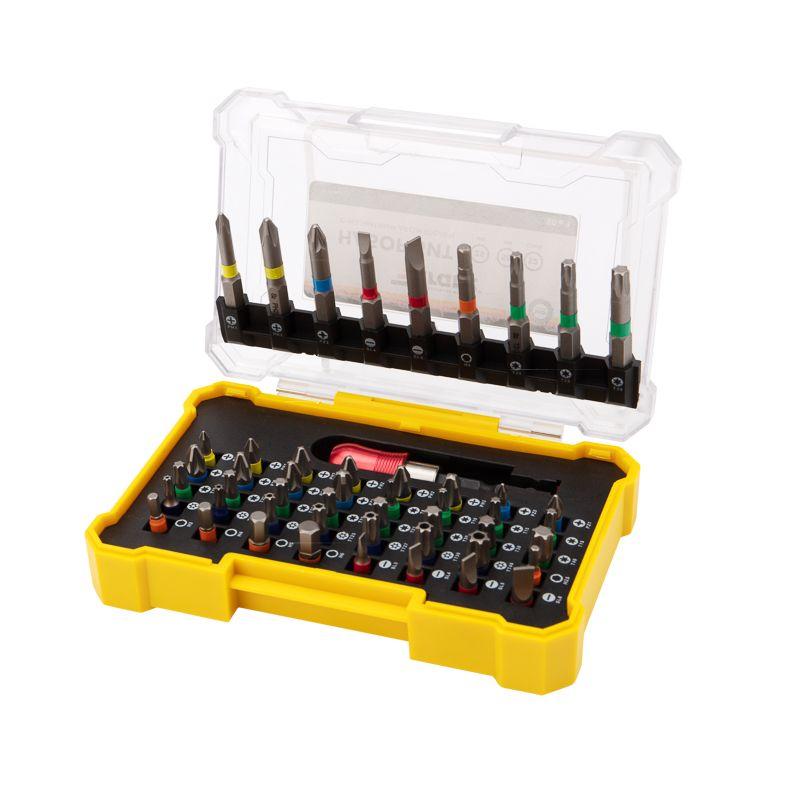 Комплектация: биты типа PH (8 шт.), биты типа PZ (7 шт.), биты типа Torx (22 шт.), биты типа SL (6 шт.), биты типа HEX (6 шт.), магнитный держатель (1 шт.). Набор упакован в удобный для хранения кейс, где для каждой биты предусмотрена отдельная ячейка.