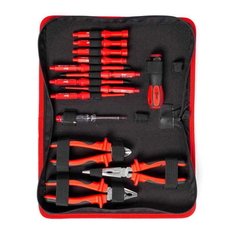 Включает диэлектрические бокорезы 160 мм; пассатижи 180 мм; длинногубцы 200 мм; сменные отвертки шлицевые 2,5 х 100; 4 х 100; 5,5 х 100; а также отвертки PH 1 х 100; PH 2 х 100; тестер напряжения на 110–250 В; ключи для шкафов 6 x 47; 8 x 47; 9 x 47; 5,3 x 47; диэлектрическую рукоятку для сменных отверток и вращающуюся насадку.