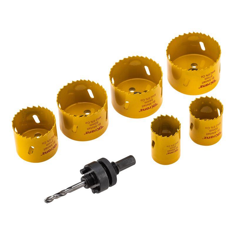 Коронки, входящие в состав набора, выполнены из инструментальной стали, а зубья с переменным шагом 4-6 мм изготовлены из быстрорежущей стали Р6М5К8 с добавлением 8% кобальта, что обеспечивает стойкость к перегреву.