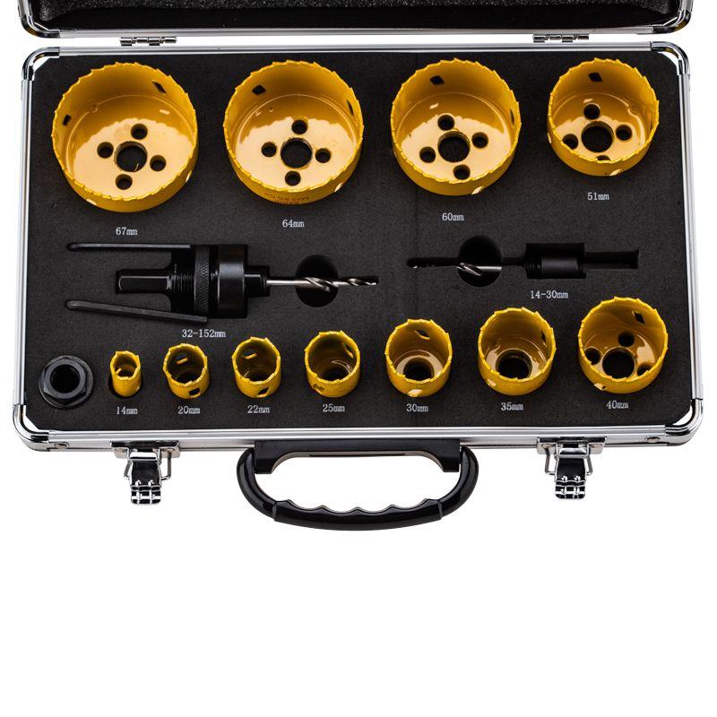 Набор поставляется в металлическим кейсе. В комплектацию входят 16 предметов: 6 коронок диаметром 14, 20, 22, 25, 30, 35, 40, 51, 60, 64, 67 мм , 2 хвостовика для коронок, 2 шестигранных ключа, 1 адаптер.