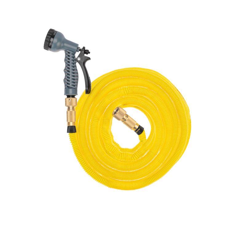 Поливочный шланг устойчив к износу и воздействию внешних факторов, не образует перегибов. При подаче воды шланг растягивается до 45 метров. При хранении не занимает много места.