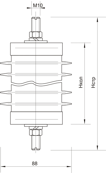 Ограничитель представляет собой защитный аппарат опорного исполнения, содержащий последовательно соединенные оксидно-цинковые варисторы, заключенные в герметизирован- ный полимерный корпус.
