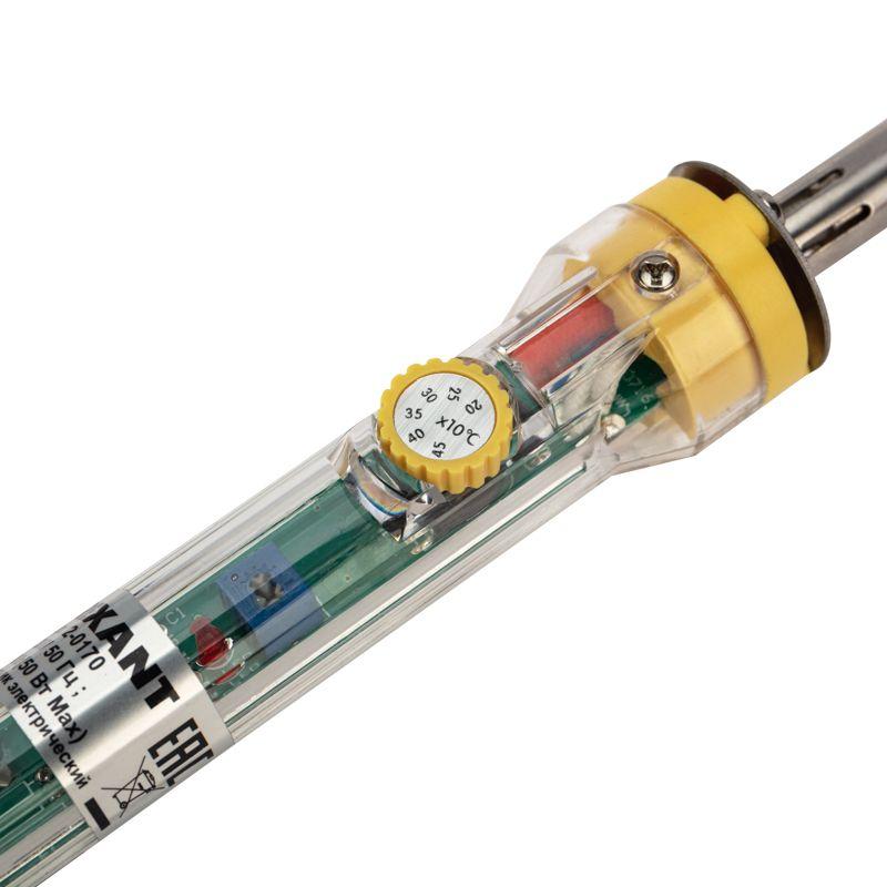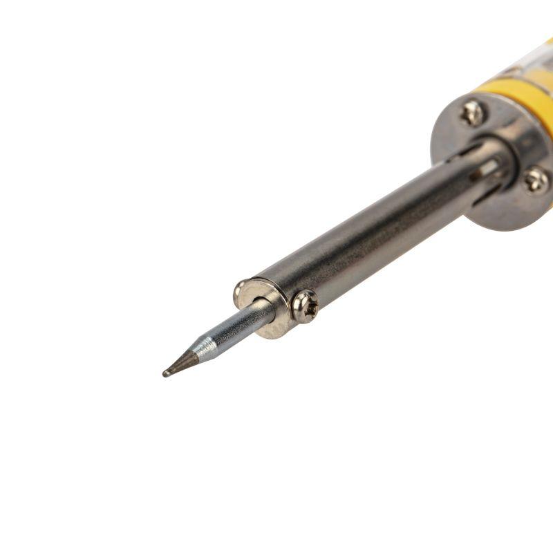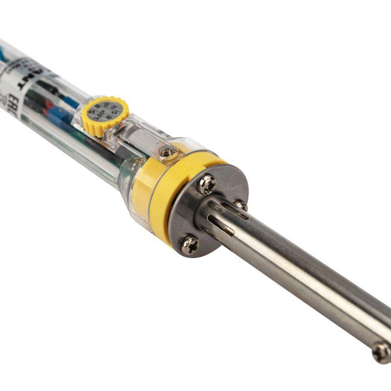 Паяльник выполнен с керамическим нагревательным элементом, поэтому нагревается быстрее, чем нихромовый и при бережном отношении прослужит много долгих лет. Удобная эргономичная рукоятка выполнена из прозрачного термостойкого пластика.