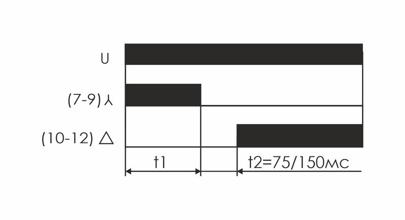 Реле времени имеет 2 релейных выхода. Каждый управляет отдельным контактором. В момент пуска его первый выход включает контактор S? (замыкаются контакты 7-9) и обмотки электродвигателя подключаются по схеме «ЗВЕЗДА», что снижает пусковой ток в несколько раз. По окончании времени выхода двигателя на рабочий режим (время t1) наступает пауза (t2), когда оба контактора выключены, затем включается контактор S? (замыкаются контакты 10-12), включающий обмотки по схеме «ТРЕУГОЛЬНИК».