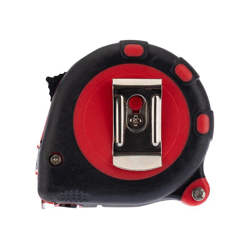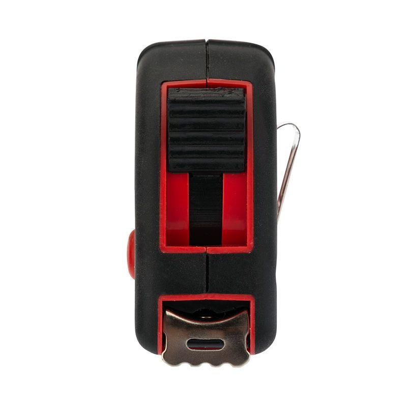 На корпусе расположена клипса-зажим для фиксации рулетки на ремне, кармане или поясной сумке. Ремешок позволяет надевать инструмент на запястье, чтобы освободить руки для работы.