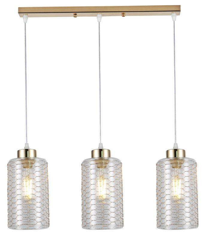 Подвесные светильники Malice на удлиненной рейке золотого цвета объединяют сразу 3 стеклянных плафона на прочных прозрачных тросах. Эти подвесные светильники под три лампы Е27 40 Вт освещают 9 м2 и могут применяться как полноценная люстра. Окрашивание металлических элементов произведено гальваническим способом, что обеспечивает стойкость и красоту золотого цвета. Прозрачное стекло и золотистая арматура великолепно сочетаются.