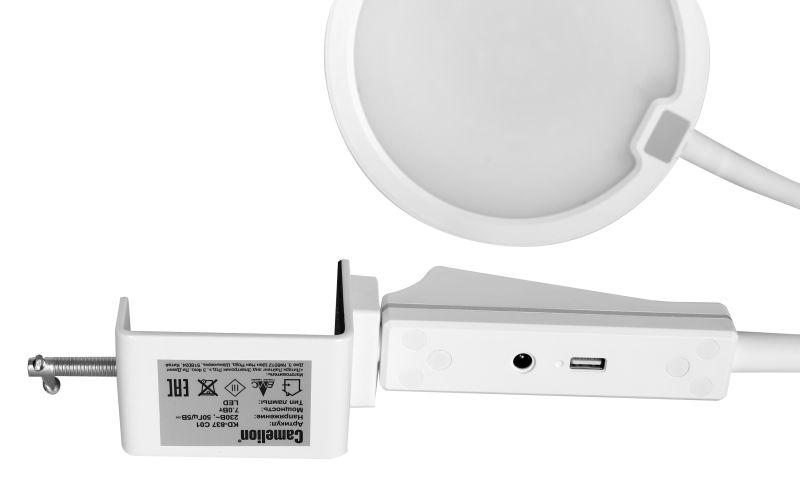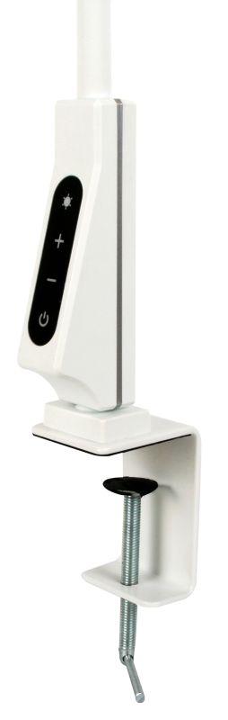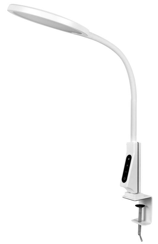 Гибкая металлическая стойка имеет силиконовое покрытие. Мощная металлическая струбцина надежно фиксирует светильник на любой поверхности толщиной до 6,5 см. Пластиковый плафон имеет форму диска диаметром 16 см. Максимальная высота плафона над уровнем стола в рабочем положении ~ 42 см. Длина провода питания – 150 см.