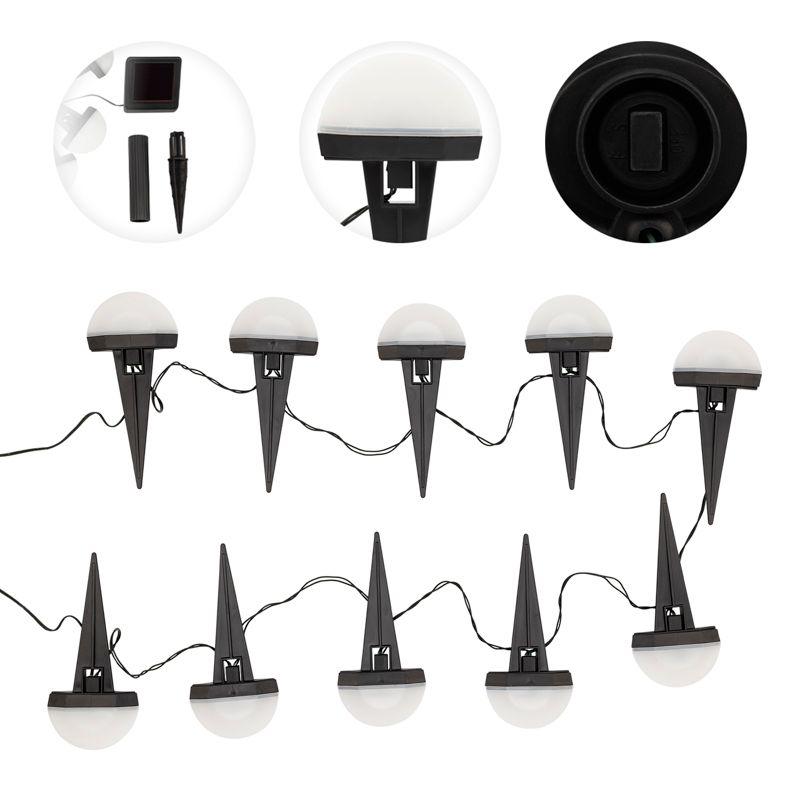 Представляет собой десять полусфер на колышках с холодным белым свечением. Светильник оснащен выносной солнечной панелью, которая заряжает аккумулятор в дневное время суток, а ночью изделие автоматически включается и освещает пространство вокруг.