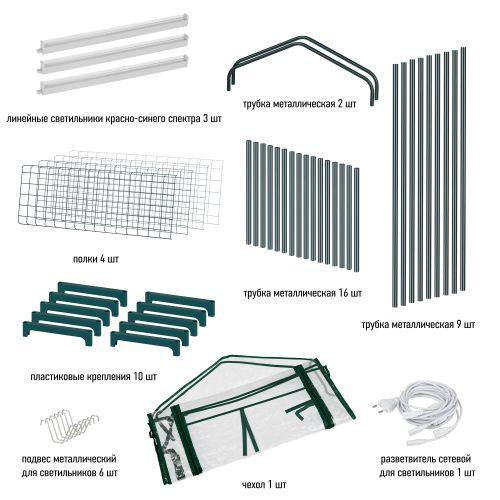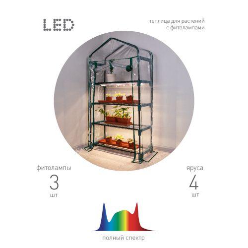 Теплица с фитосветильниками FITO-House - 4 отлично поместится на балконе, у окна или в любом другом месте квартиры, дома. Её габариты:<em> </em>690 х 300 х 1250 мм. Высота полок - 30 см, верхний ярус имеет небольшой купол и подходит для размещения более высоких растений. <em><strong>Качественный и надёжный металлокаркас дополняет прочный прозрачный кожух с удобной молнией.</strong></em> Кожух защищает растения от сквозняков, создаёт внутри теплицы необходимый для быстрого развития растений микроклимат. Благодаря молнии кожух легко открывается для проветривания, полива, замены ящиков или горшков. Теплица очень проста в сборке, не требует специального инструмента или особых навыков - справится любой! Для подсветки каждого яруса теплицы ЭРА FITO-House-4 в комплекте поставляются 3<em><strong> фитосветильника красно-синего спектра ЭРА FITO-9W-Т5-N</strong></em>. В них использованы давно зарекомендовавшие себя светодиоды Nationstar. Свечение фиолетовое - оно абсолютно безопасно для человека и животных, при этом сверхэффективно для роста и развития растений .