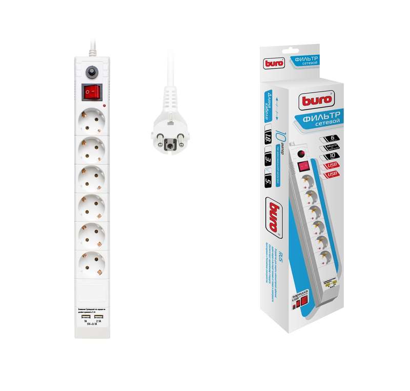 Длина шнура составляет 5 м, с розеткой типа "евро". Количество гнезд для подключения: 6 шт. Предусмотрены два USB-входа для подключения устройств с такими входами.