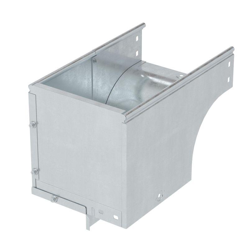 Угол применяется с лотками шириной 500 мм и высотой 100 мм. Внутренний радиус аксессуара - 80 мм. Толщина стали – 0,8 мм. Исполнение – "сталь, оцинкованная по методу Сендзимира". Применение комплектных аксессуаров облегчает расчет числа необходимых элементов для монтажа – в комплект уже входят соединительные пластины и детали крепежа.