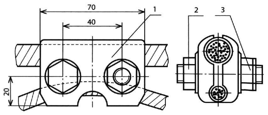 Назначение: для крепления медных сечением 25-35 мм2 и сталемедных диаметром 6 мм рессорных струн к медному и сталемедному несущему тросу сечением 95-120 мм2.